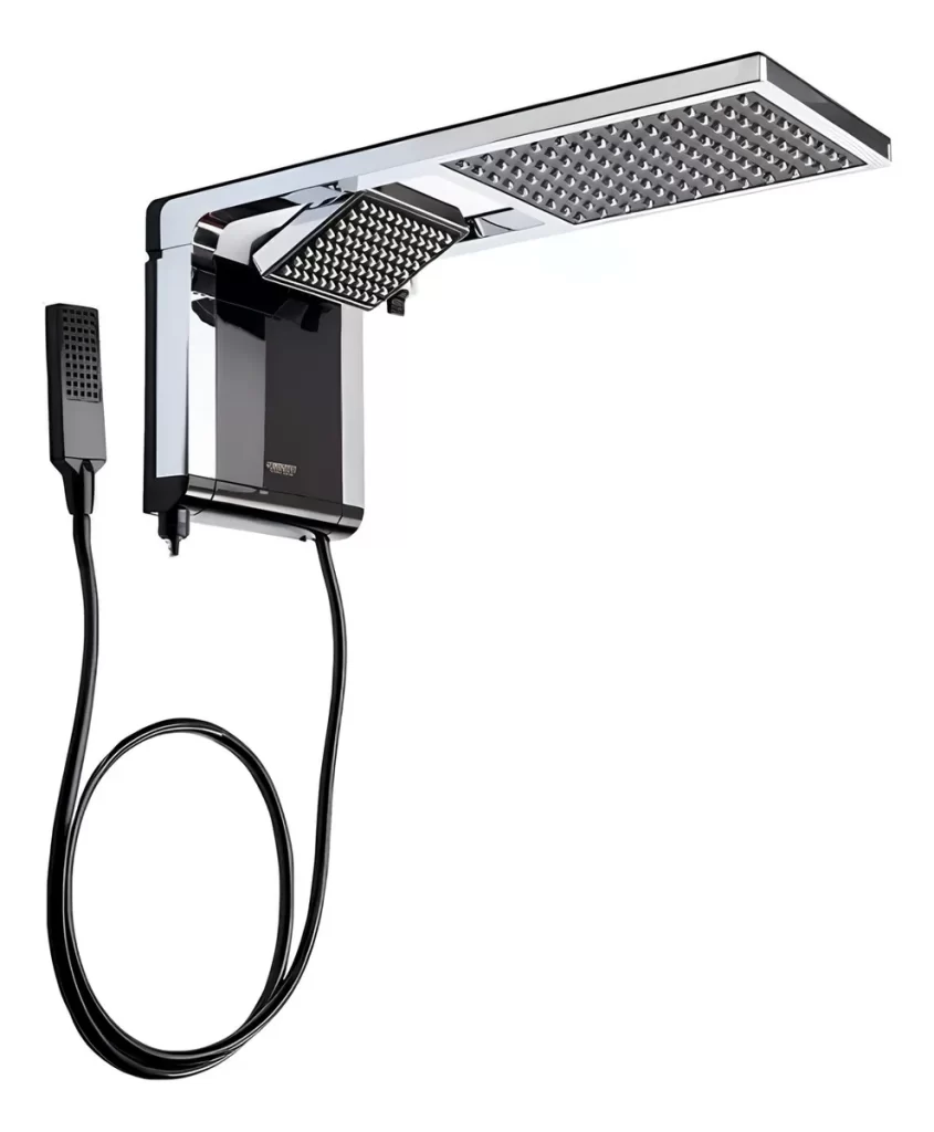- Design moderno com função dupla: ducha profunda e chuveiro mais amplo e suave. Possui tecnologia Press Plus para alta performance com baixa pressão, comando eletrônico de temperatura, resistência Loren Ultra de longa duração e compatibilidade com aquecimento solar e outros sistemas
